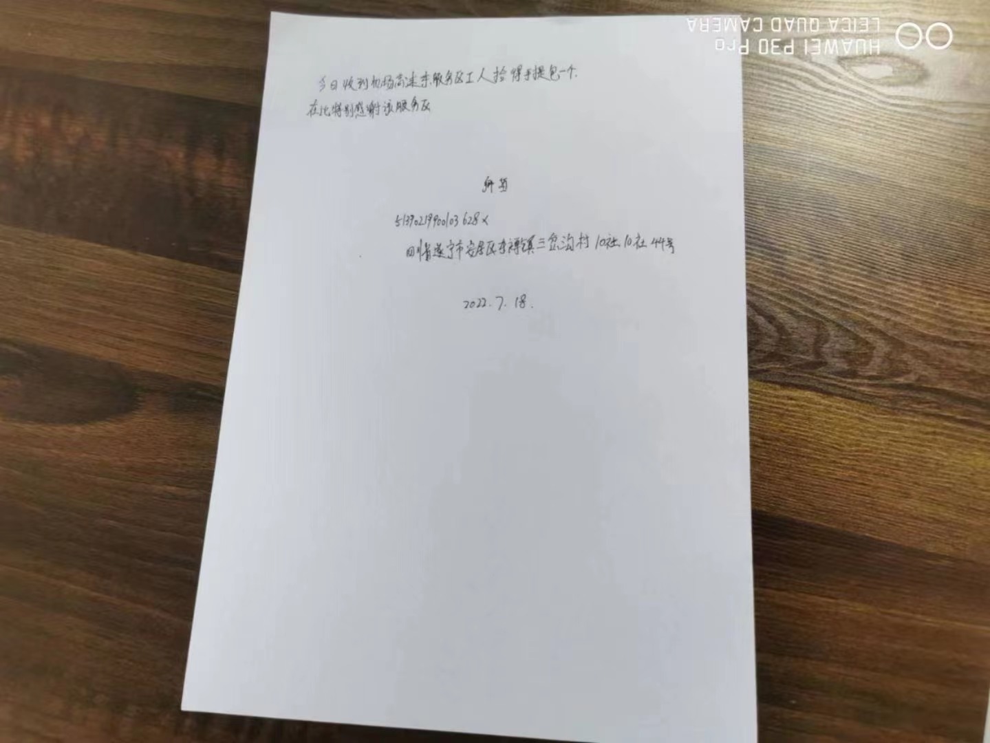我公司天府机场东服务区外场保洁队员在日常巡逻场区时拾到旅客手提包一个,立即上交物业办公室,现场主管通过身份信息马上联系失主,失主对物业这种失金不昧的精神表示万分感谢,主动留下感谢信以资鼓励。